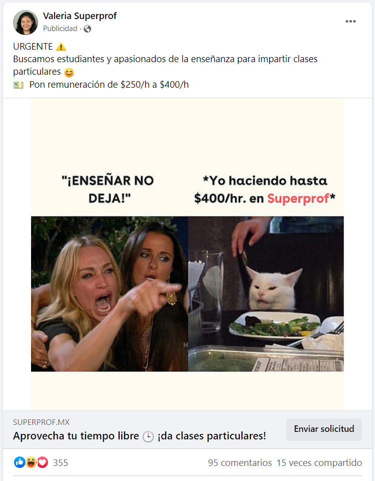 Así, podemos ver que Superprof utiliza anuncios cargados de humor y referencias a la cultura de internet como el uso de memes, de esta manera se puede acerca de un modo más casual y, ciertamente, más efectivo a su audiencia meta.