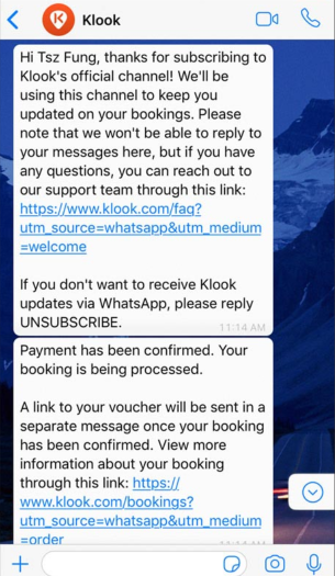 La plataforma de viajes online Klook decidió utilizar WhatsApp para la satisfacción del cliente y para aumentar la retención. Por lo tanto, la empresa construyó su estrategia de marketing en torno a actualizaciones y notificaciones sobre reservas.