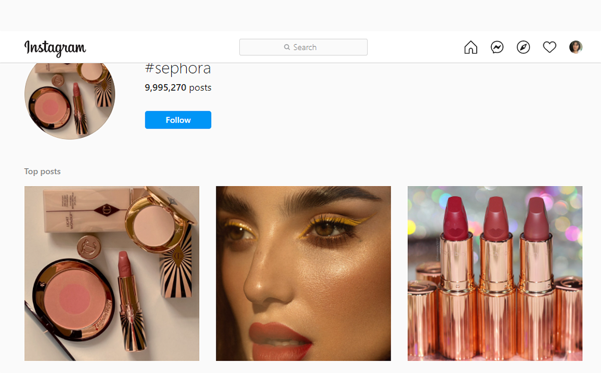A continuación puedes ver el hashtag de la marca Sephora, un minorista francés de productos de belleza. Los clientes de la empresa suelen utilizar el hashtag de la marca para compartir sus experiencias y recomendar Sephora.