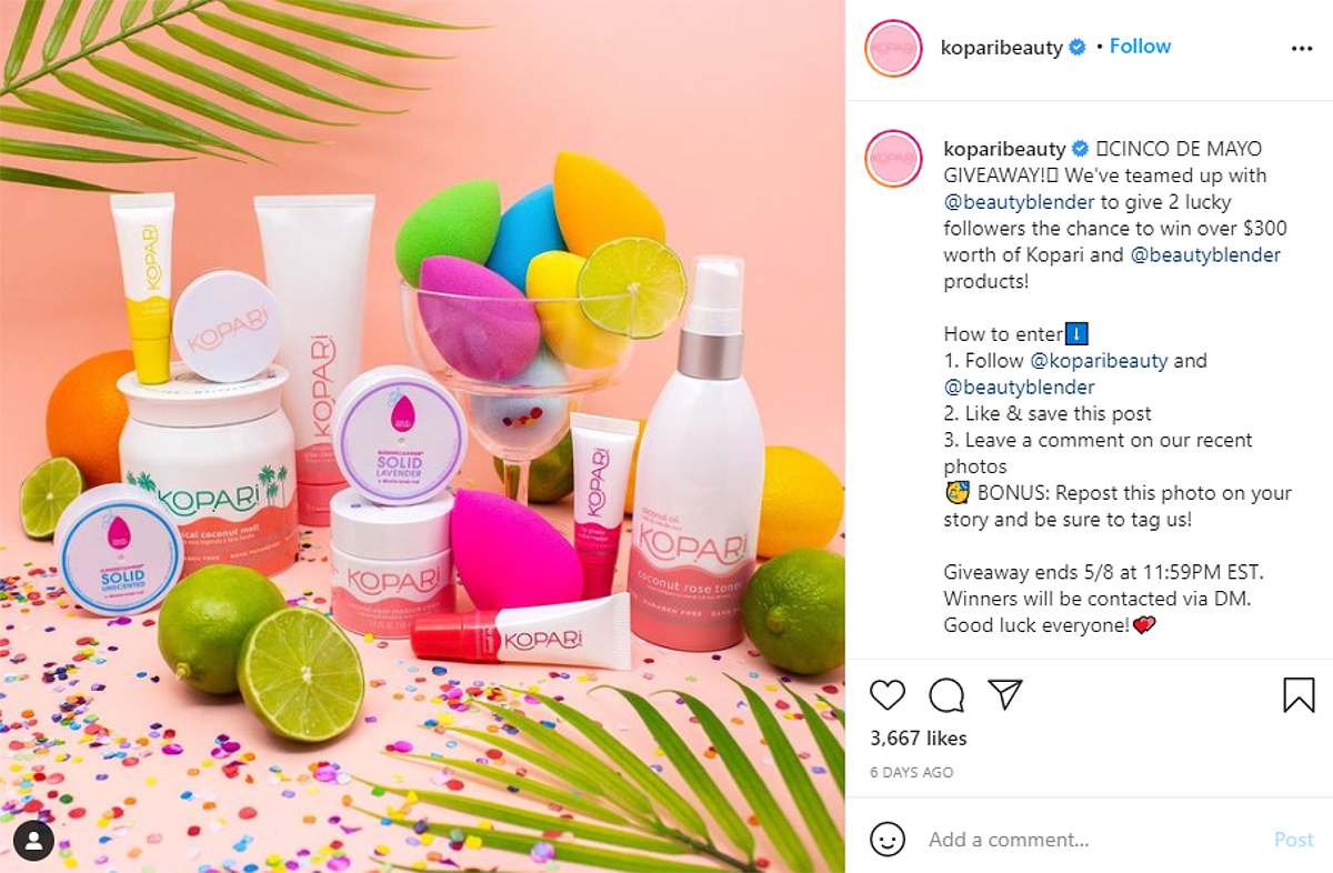 Tomemos el ejemplo de Kopari. Esta empresa de productos de belleza a base de coco decidió organizar un sorteo para sus seguidores.