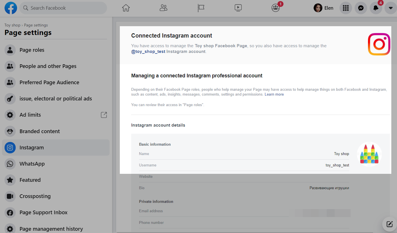 Чтобы проверить в настройках Facebook, перейдите в панели управления страницы вашей компании во вкладку Настройки > Instagram и слева в настройках должен отображаться нужный Instagram аккаунт.