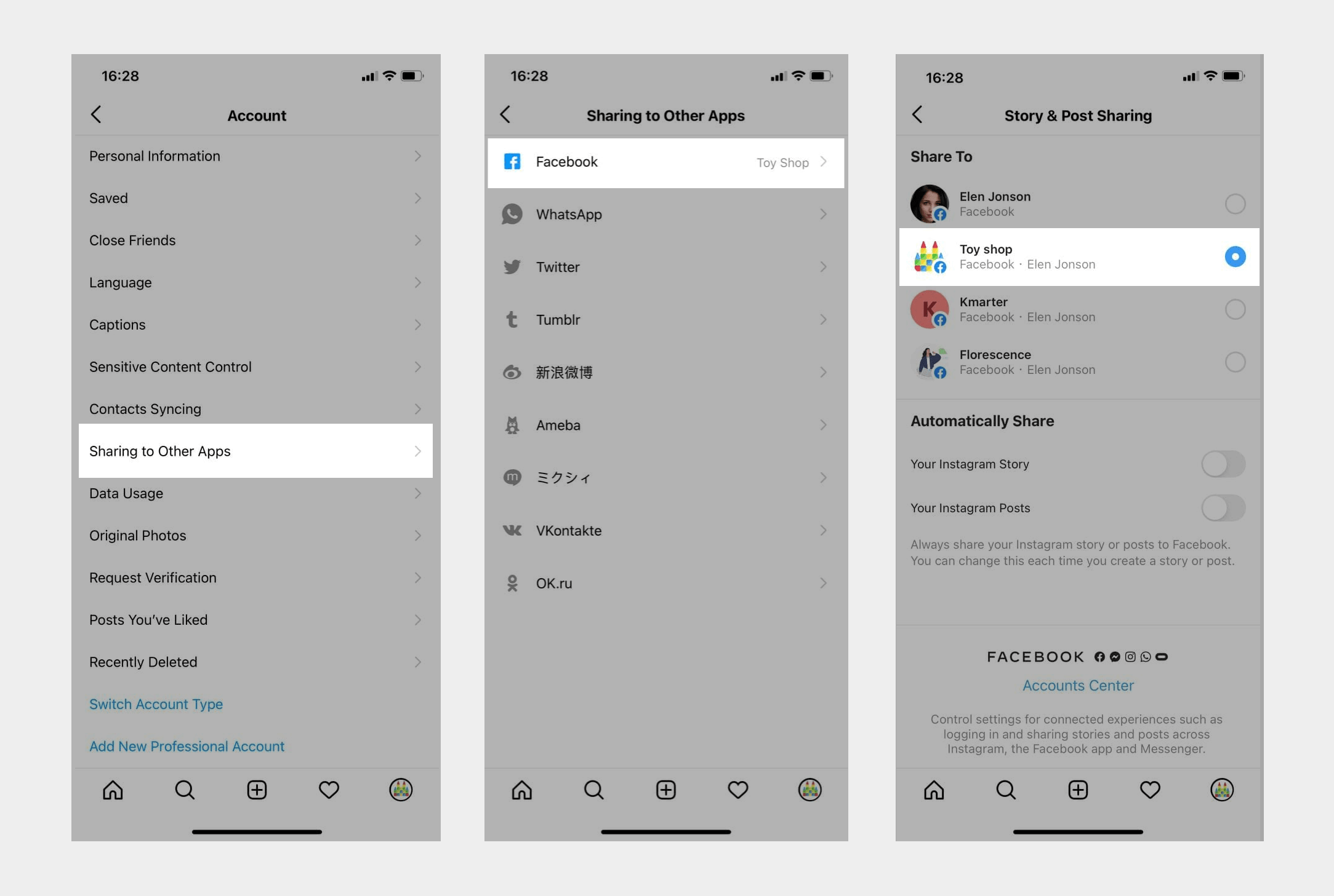 Чтобы проверить в настройках Instagram, перейдите в левое верхнее меню ☰ > Настройки > Аккаунт > Публикация в других приложениях > Facebook и в настройках должна быть выбрана нужная Facebook страница.