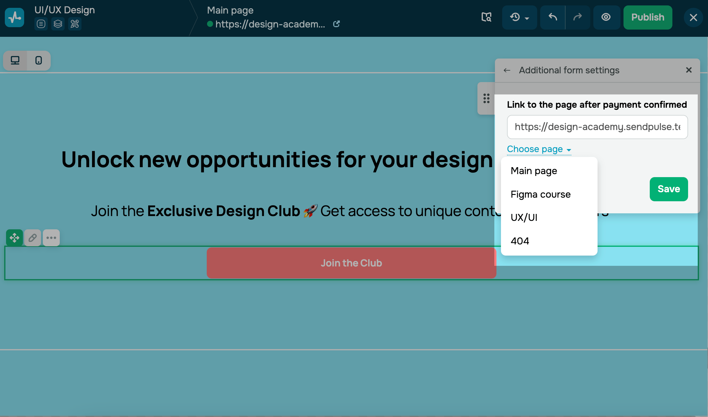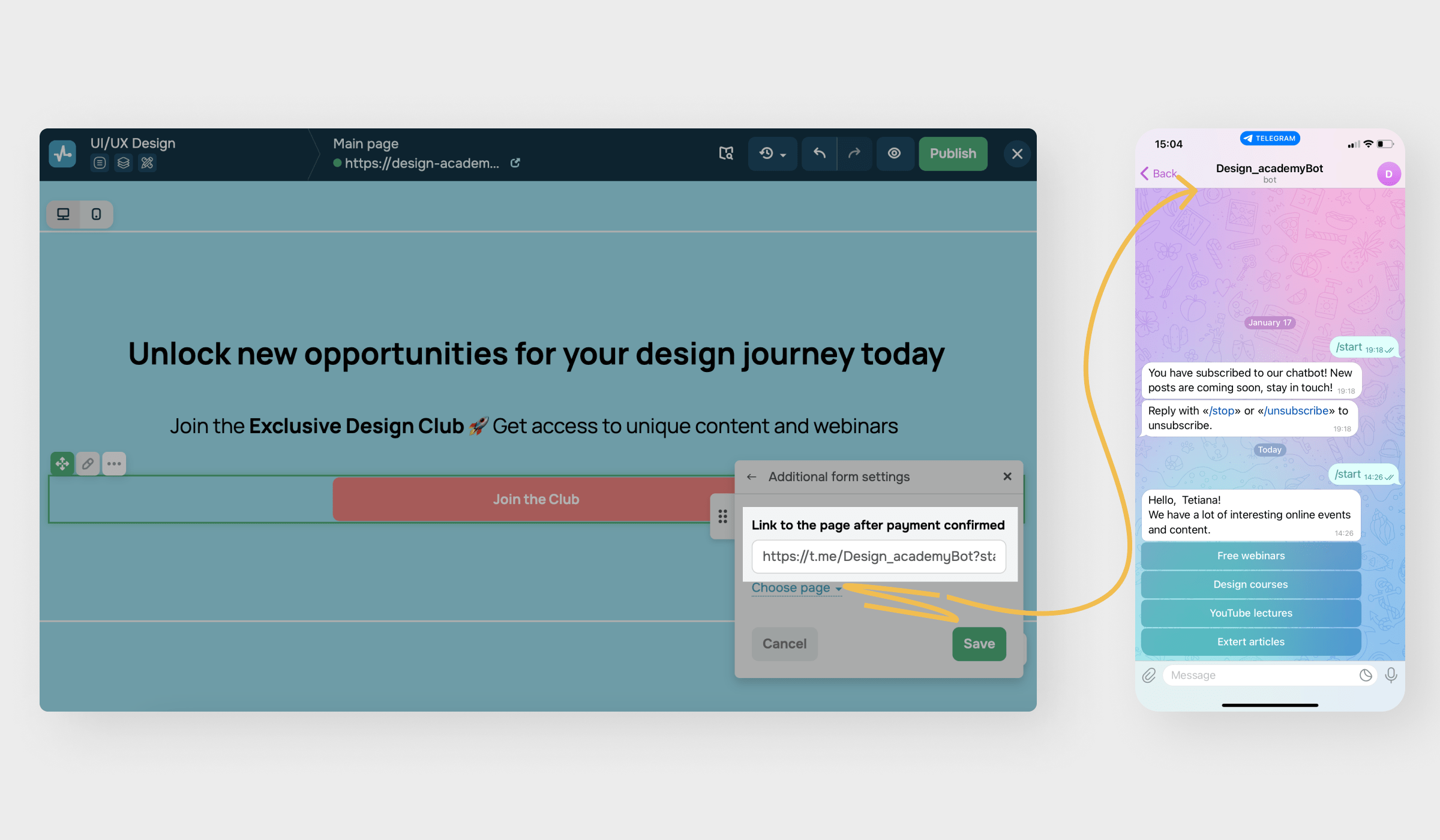 Перейдите в Дополнительные настройки формы (Additional form settings), в поле Ссылка на страницу после подтверждения оплаты (Link to the page after payment confirmed) введите URL или ссылку на запуск чат-бота.