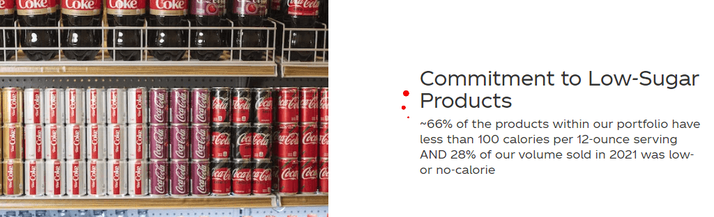 Согласно данным самой компании, в ее портфеле доля напитков, которые содержат менее 100 калорий на 355мл (12 унций) составляет примерно 66%. А часть проданных низкокалорийных или безкалорийных продуктов в 2021 году составила 28%.