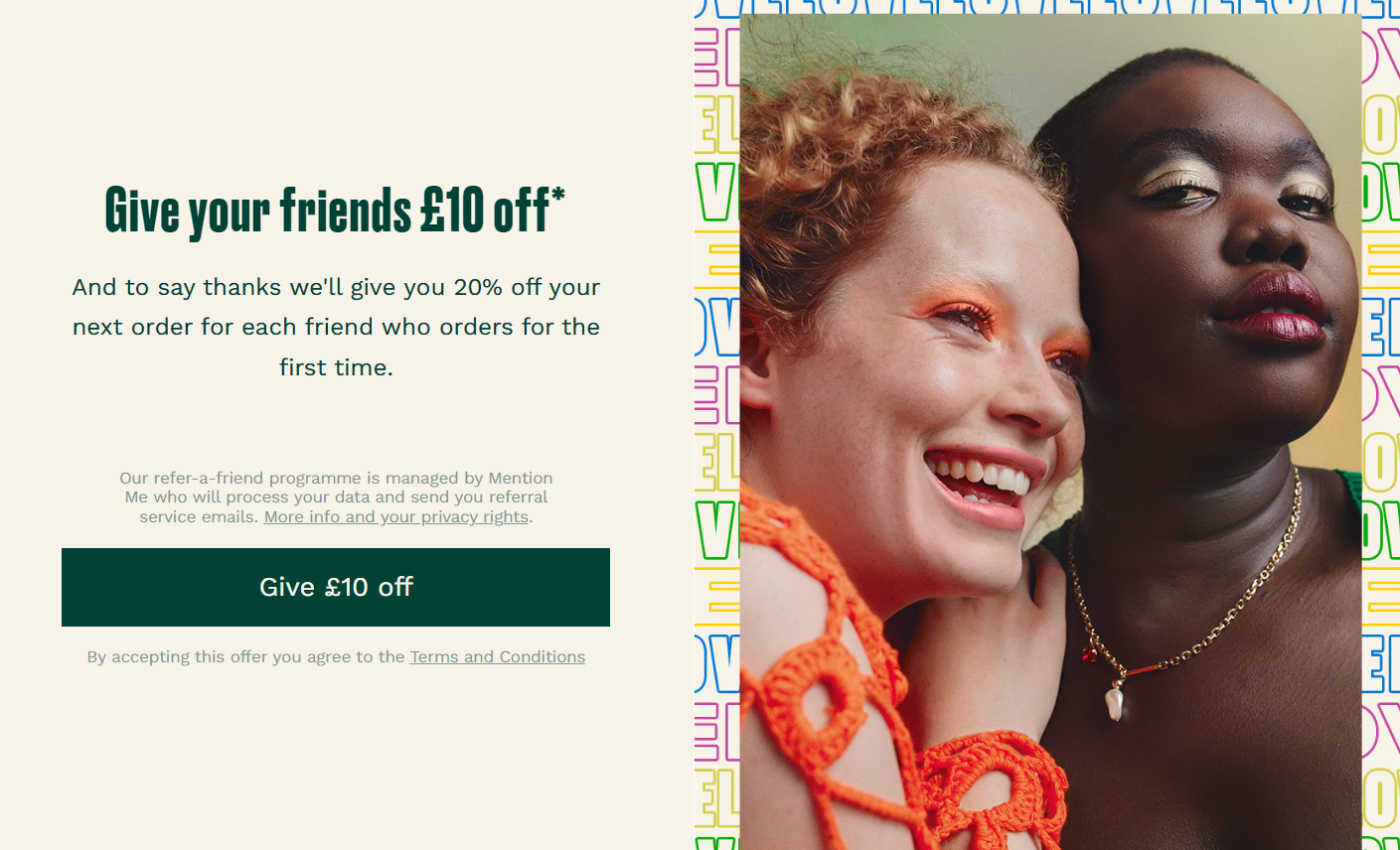 Below, you can see a referral program from The Body Shop. The well-known brand encourages clients to participate for 20% off their next orders after they invite a friend.