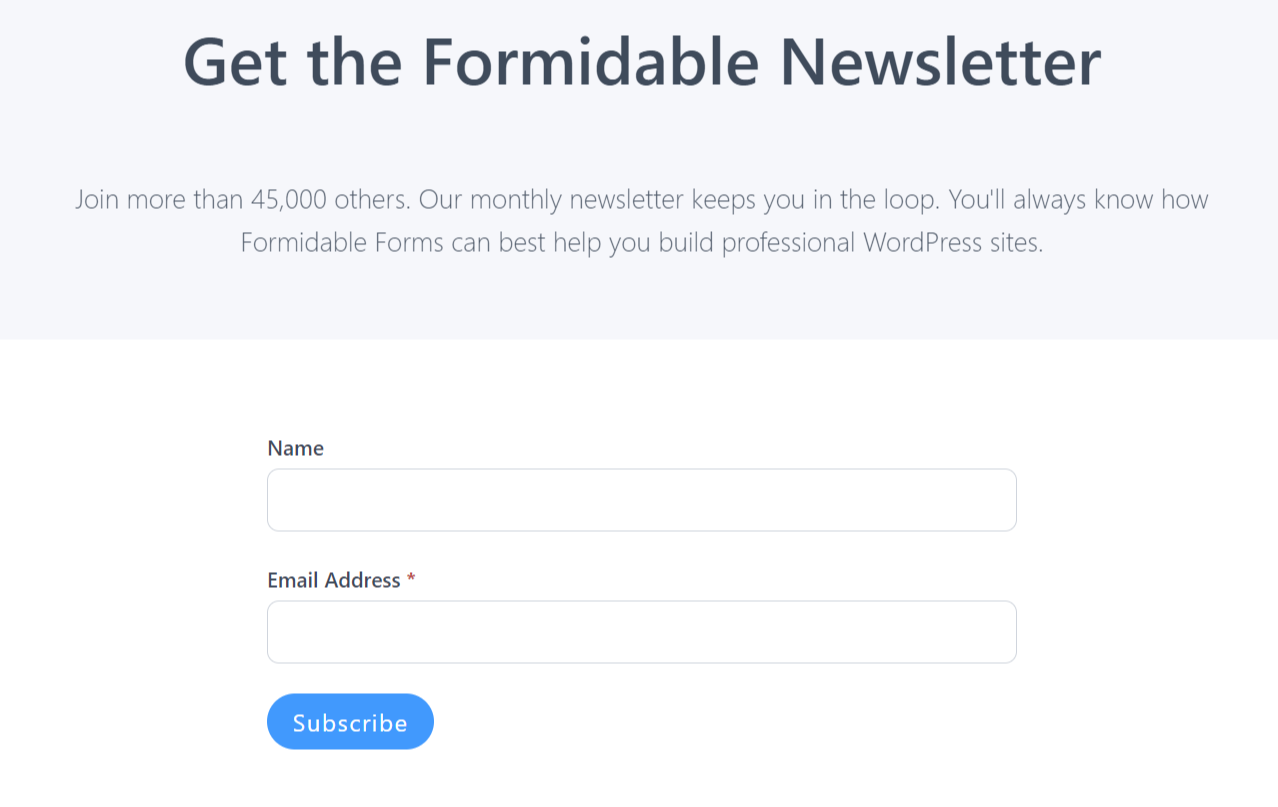 For example, below is a subscription form from Formidable, where users can provide their names and emails to sign up for the company's newsletter.