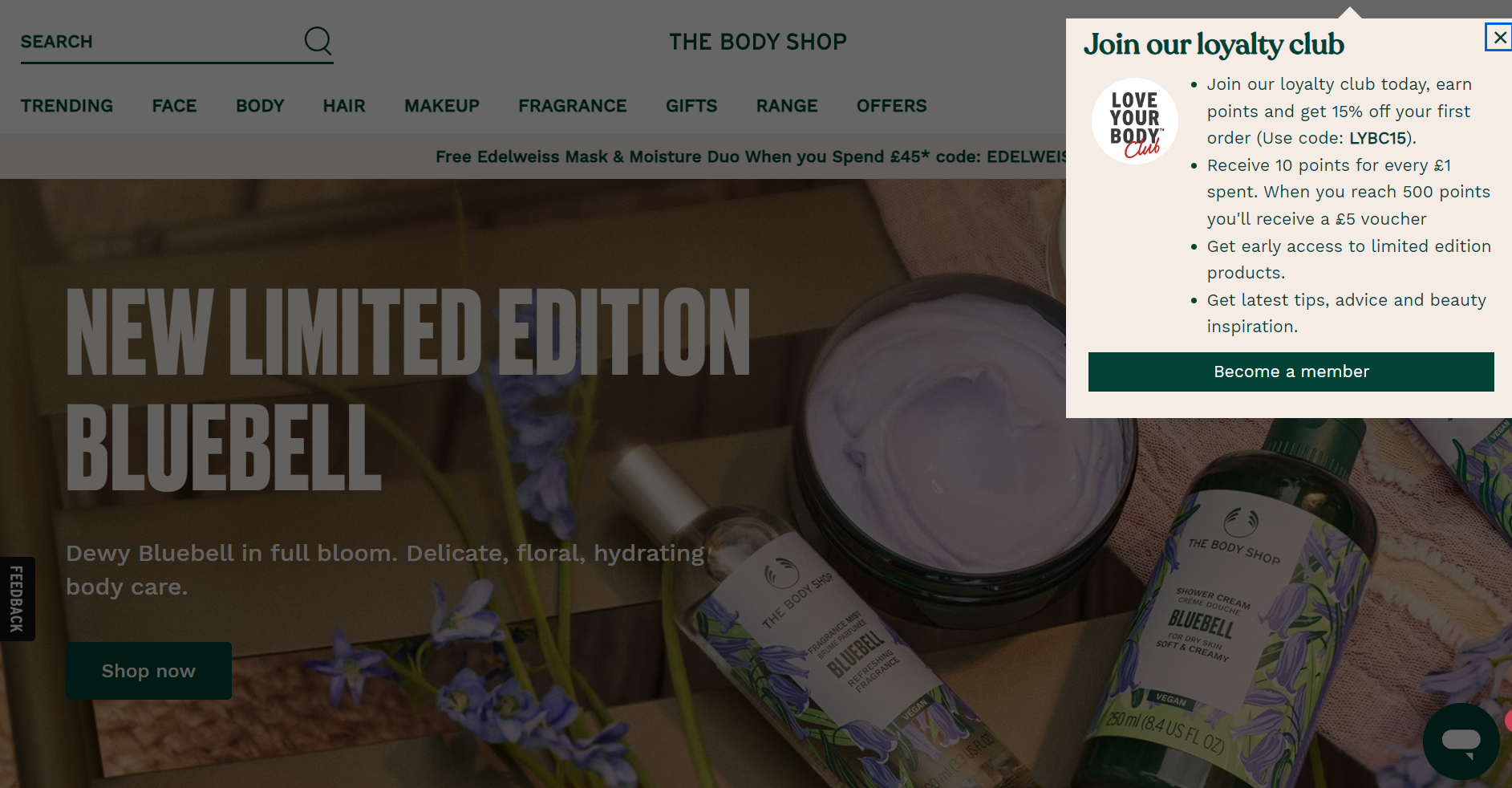 The Body Shop is known worldwide for its cruelty-free products. The company invites users to join its loyalty club and enjoy its perks. When prospects sign up, the famous brand offers 15% off the first purchase. Leads can insert the code to take advantage of the offer. They only need to provide their emails.