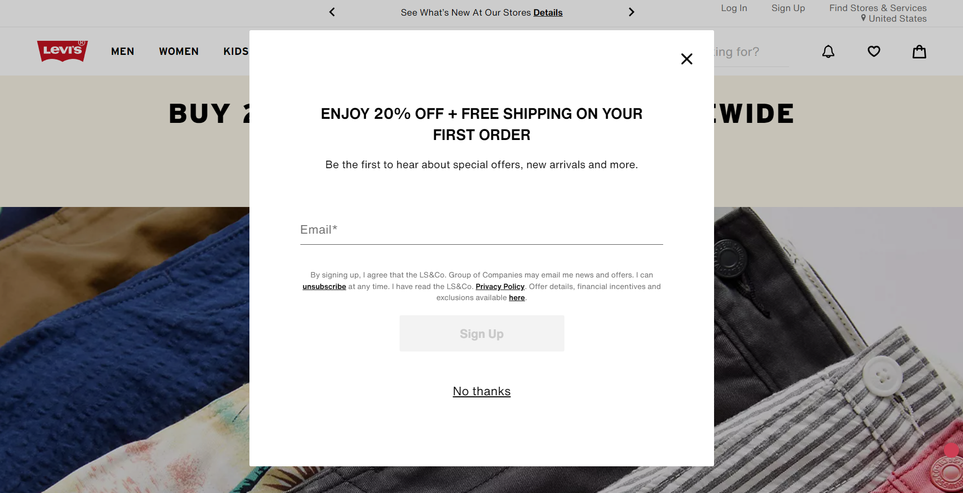 Levi’s, an American clothing brand, uses pop-ups with lead magnets to collect contact data. Once users open its website, they will see a pop-up form containing information about a 20% discount and free shipping for the first order. New customers only need to share their email addresses in the form provided.