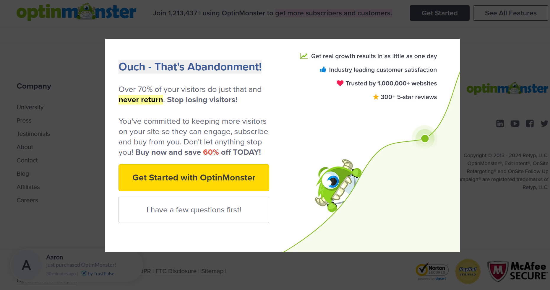 OptinMonser, a lead generation platform, ensures the form is visible to users once they visit the website. The form has a clear and compelling call to action button: “Get Started with OptinMonster.” The company also explains the reasons for using the software. If leads still have questions, they can click “I have a few questions first!” and get the answers right away.