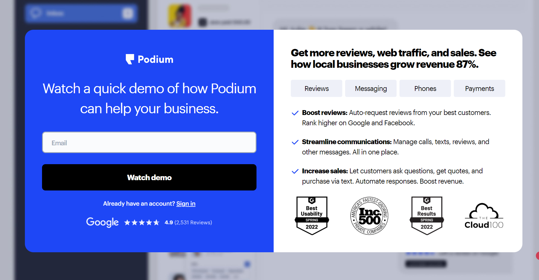 Podium invites its site visitors to take a quick demo of its product and learn how to secure more leads for a company. Users only need to click a visible call to action button, “Watch demo.” Then, they will be redirected to a page where they need to provide their email addresses in exchange for a demo.