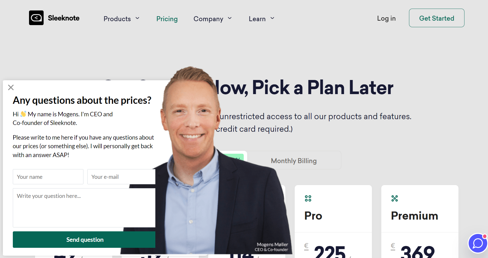Once users land on the platform’s pricing page, they will instantly see a pop-up, including the image of the company’s CEO. The form invites site visitors to ask questions regarding the prices or other topics related to the service. They need to fill in their names, email addresses, and questions to get feedback.