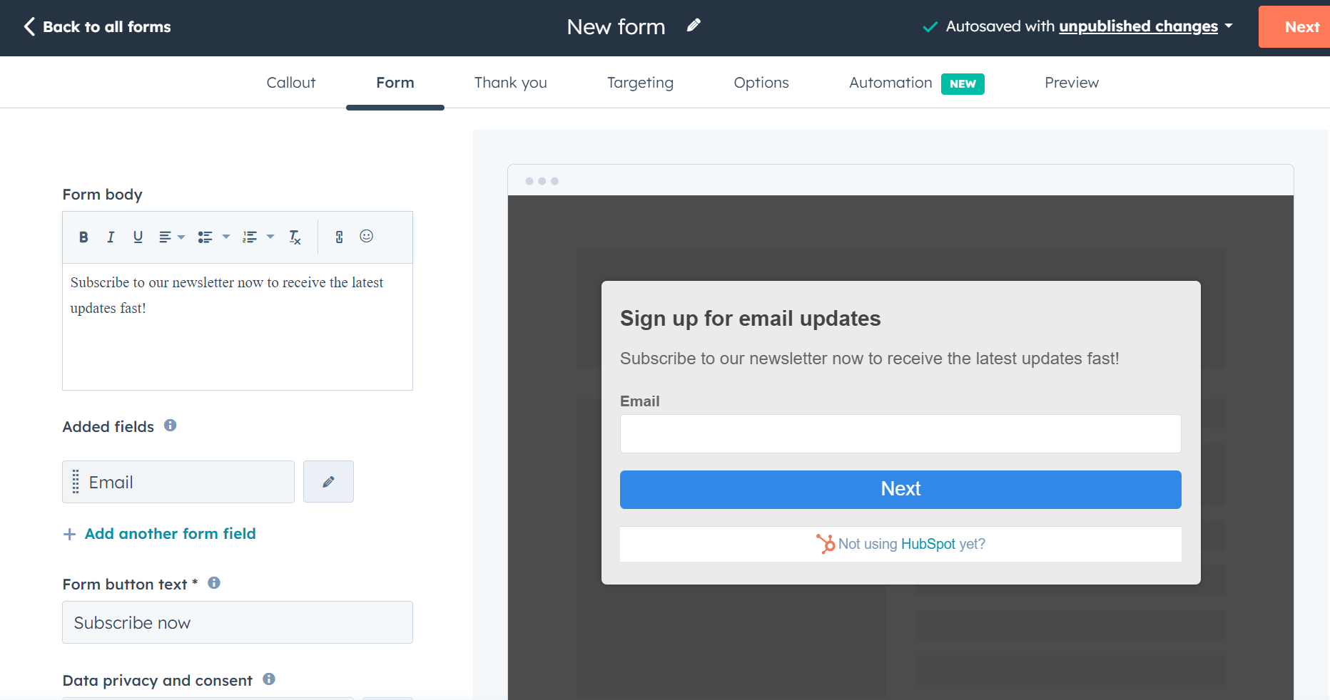 5. Send automated emails. After a lead submits the form, remember to send an automated “Welcome ” or “Thank You” message to remind prospects about your brand and encourage trust. Show them you care and remember each potential customer on your mailing list.