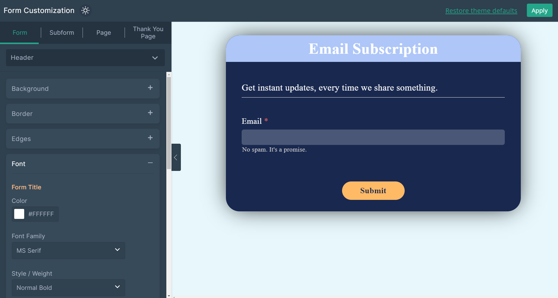 3. Add form elements based on priority. Your form should be manageable with fields users are willing to fill in. Add essential fields asking prospects their names, emails, and phone numbers to the top of your form. A call to action button and fields should stand out. For this purpose, consider using appropriate fonts, colors, and spacing to catch prospects’ attention.