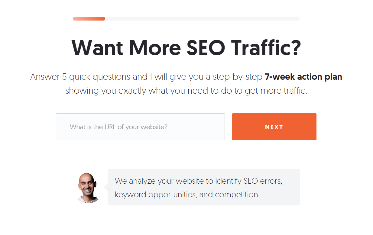 That’s what Neil Patel does. The company entices users to stay on the website and answer 5 simple questions to get a step-by-step action plan for driving traffic to your website.