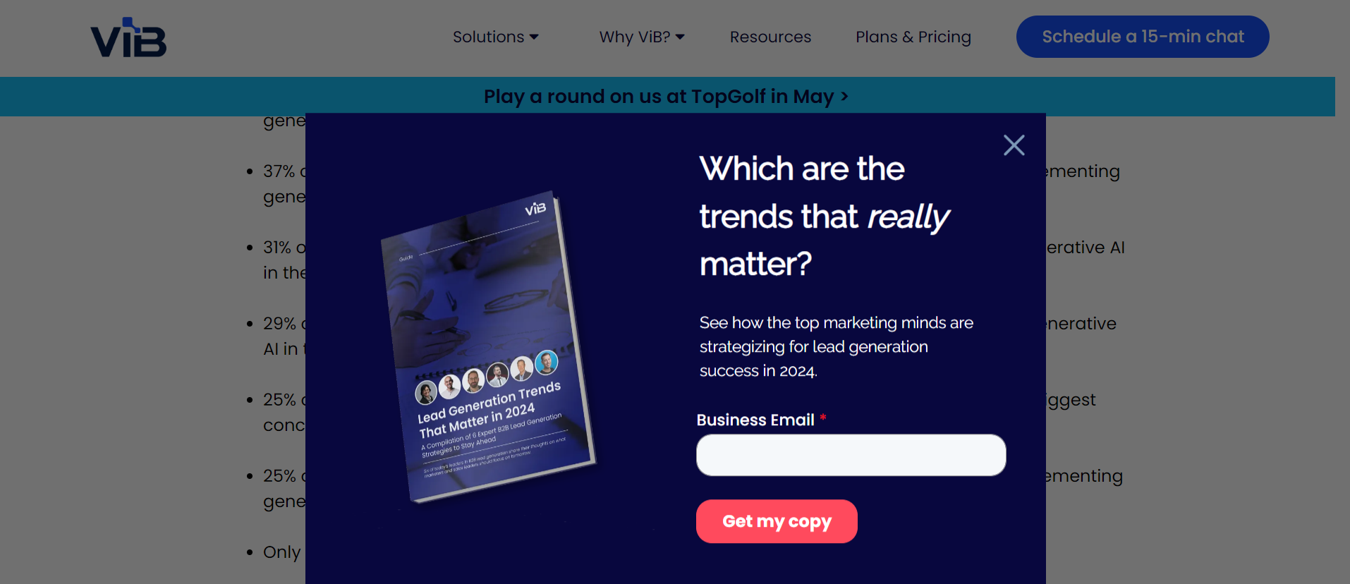 Below, you can see an example of a lead magnet pop-up on the ViB website. The pop-up encourages users to share their email addresses in exchange for a PDF about lead generation trends in 2024.