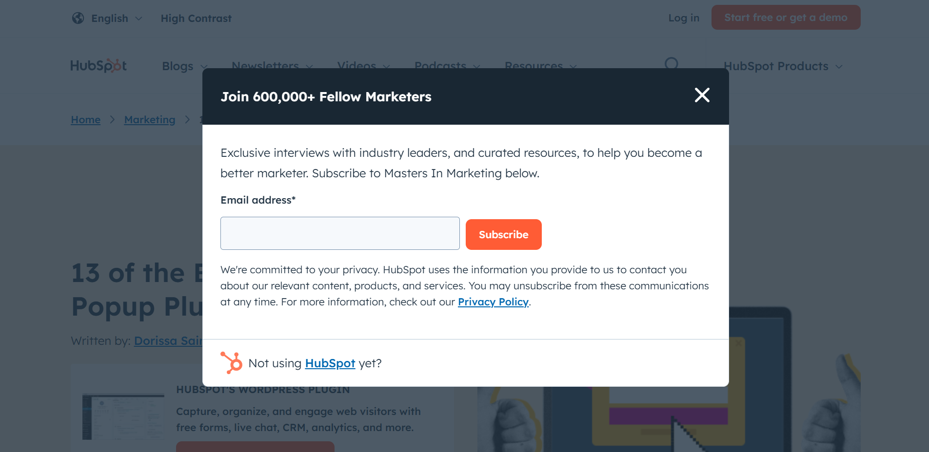HubSpot has another example of a lightbox popup encouraging customers to take the desired action. The company invites site visitors to join its community of marketers and gain valuable resources, content, and access to interviews with industry experts through an exit-intent popup. This allows users to thoughtfully review the offer and accept it by supplying their email addresses when they wish to receive content in their inboxes.