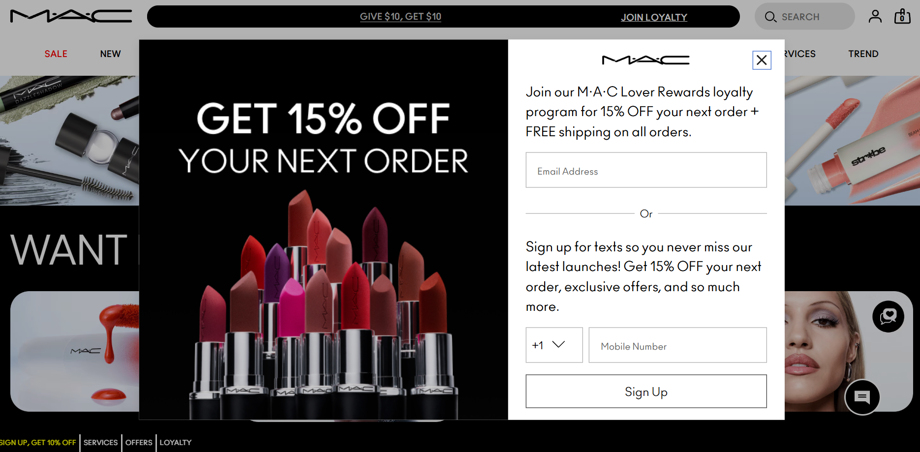 When new users arrive at this beauty brand’s website and intend to leave, they will immediately notice a popup overlaying the main content. Before visitors close the tab, MAC encourages them to sign up for its email newsletter. To increase signups, the brand offers a lead magnet in the form of a 15% discount. Joining MAC’s loyalty program enables new customers to receive a discount on their next purchase and free shipping on upcoming orders. The brand also gives prospects the option to receive SMS updates about the latest news, product launches, exclusive offers, and more.