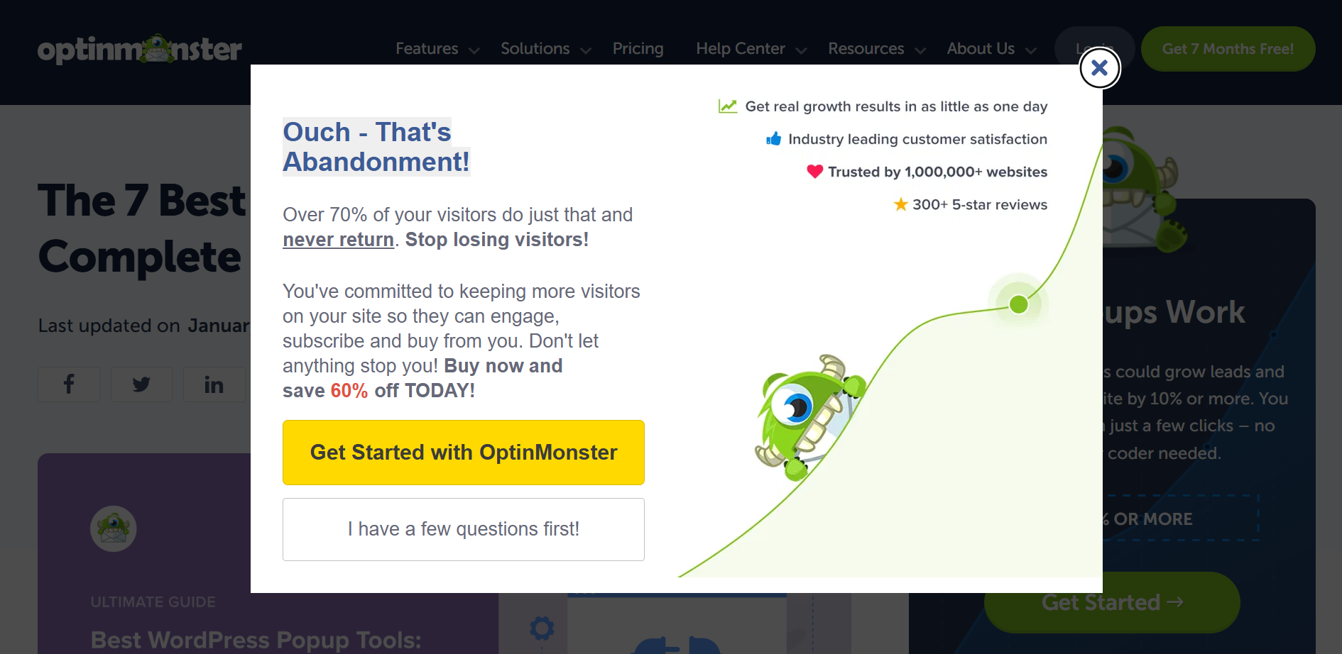 OptinMonster uses lightbox popups to make users consider getting started with OptinMonster once more. The popup has all the reasons for site visitors to do it. The company lists all its benefits, including statistics to make customers use its service to keep more visitors on their businesses’ sites. Better yet, OptinMonster offers new clients to save costs by providing 60% off.