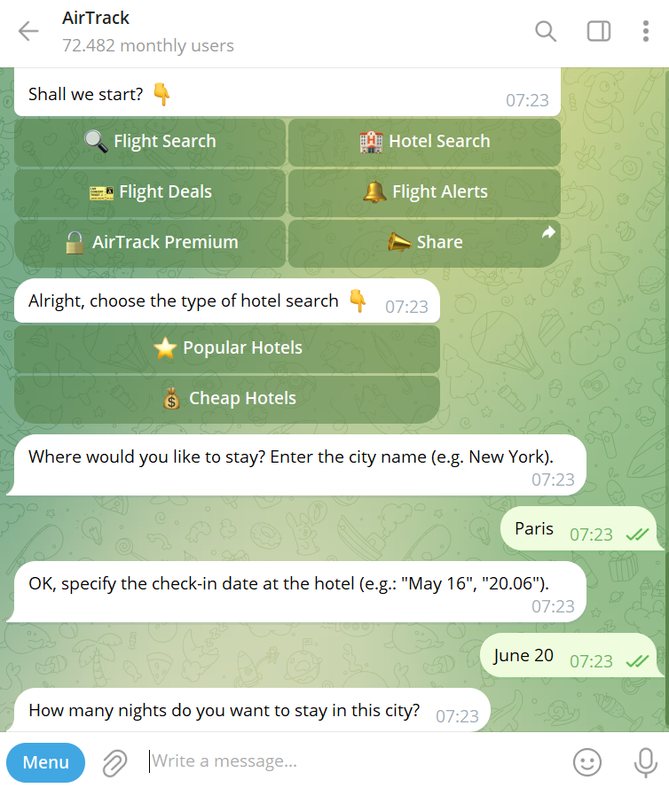 Below, you'll find a special chatbot that allows users to search for relevant flights and hotels by specifying their preferences, including price and dates.