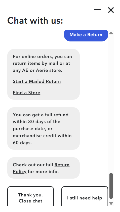 Below, you can see how customers can use a chatbot to make a return at American Eagle. It includes all the buttons and information, enabling users to complete it in seconds.