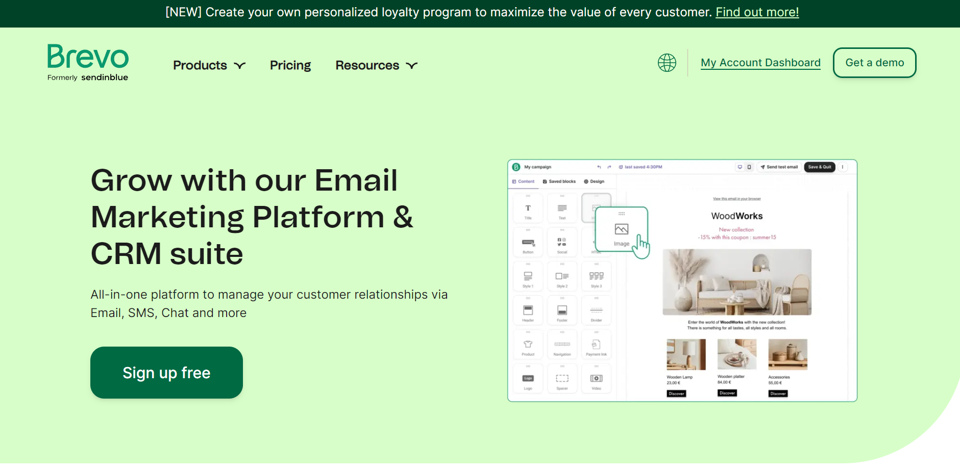 free plan: 300 emails daily, email templates, transactional emails, SMS and WhatsApp campaigns;