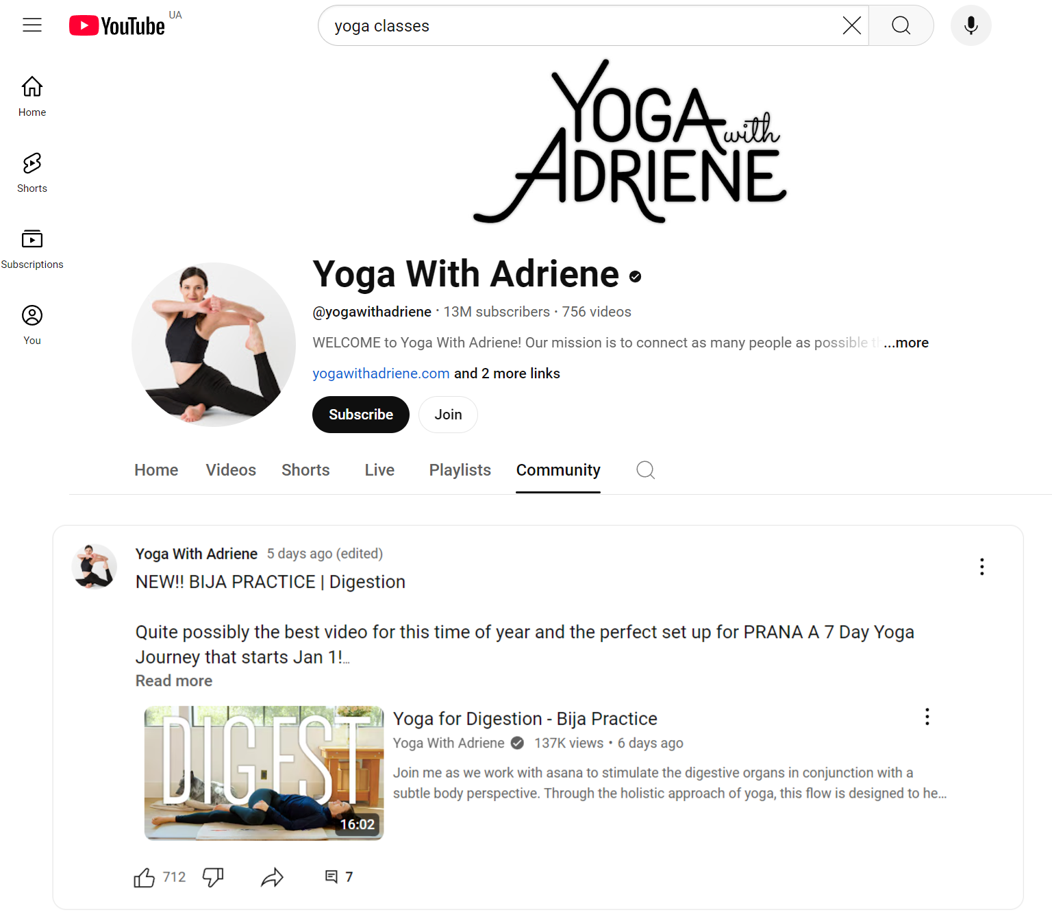 Below, you’ll find a YouTube channel with yoga classes where students can share their comments and receive responses. By having a community, this yoga teacher can better understand the audience and their preferences.