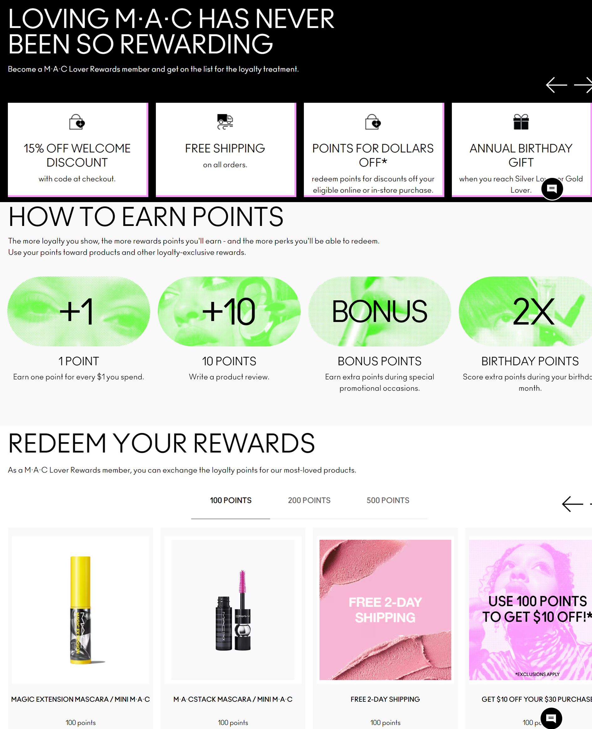 For example, MAC Cosmetics’ reward program assigns customers points and discounts after they complete their first purchases, write product reviews, and have birthdays. After they receive a specific amount of points, consumers can exchange them for MAC products.