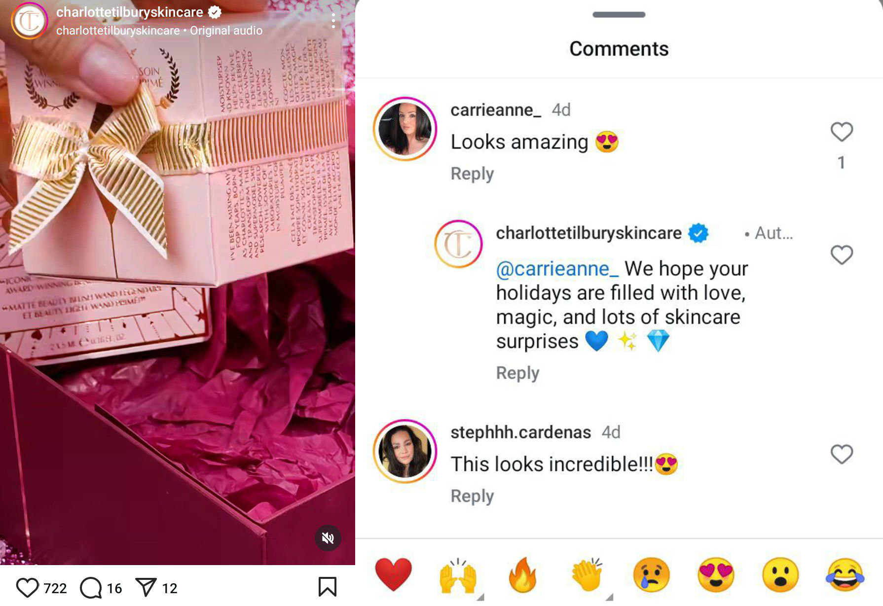 Below, you can see how Charlotte Tilbury Cosmetics’ agents reply to each comment under the brand’s posts.