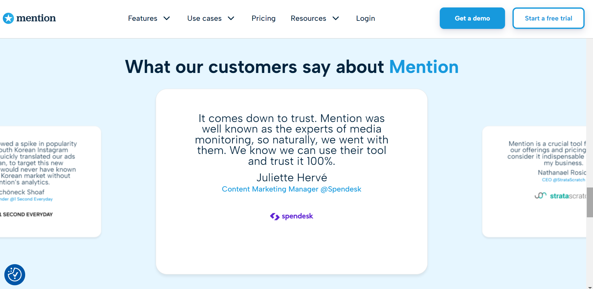 Let’s take a look at Mention’s website. On its landing page, you can see customer testimonials, including their experiences with the platform. By listing the benefits of the service, these clients encourage prospects to make faster purchasing decisions and develop deeper trust in the business.