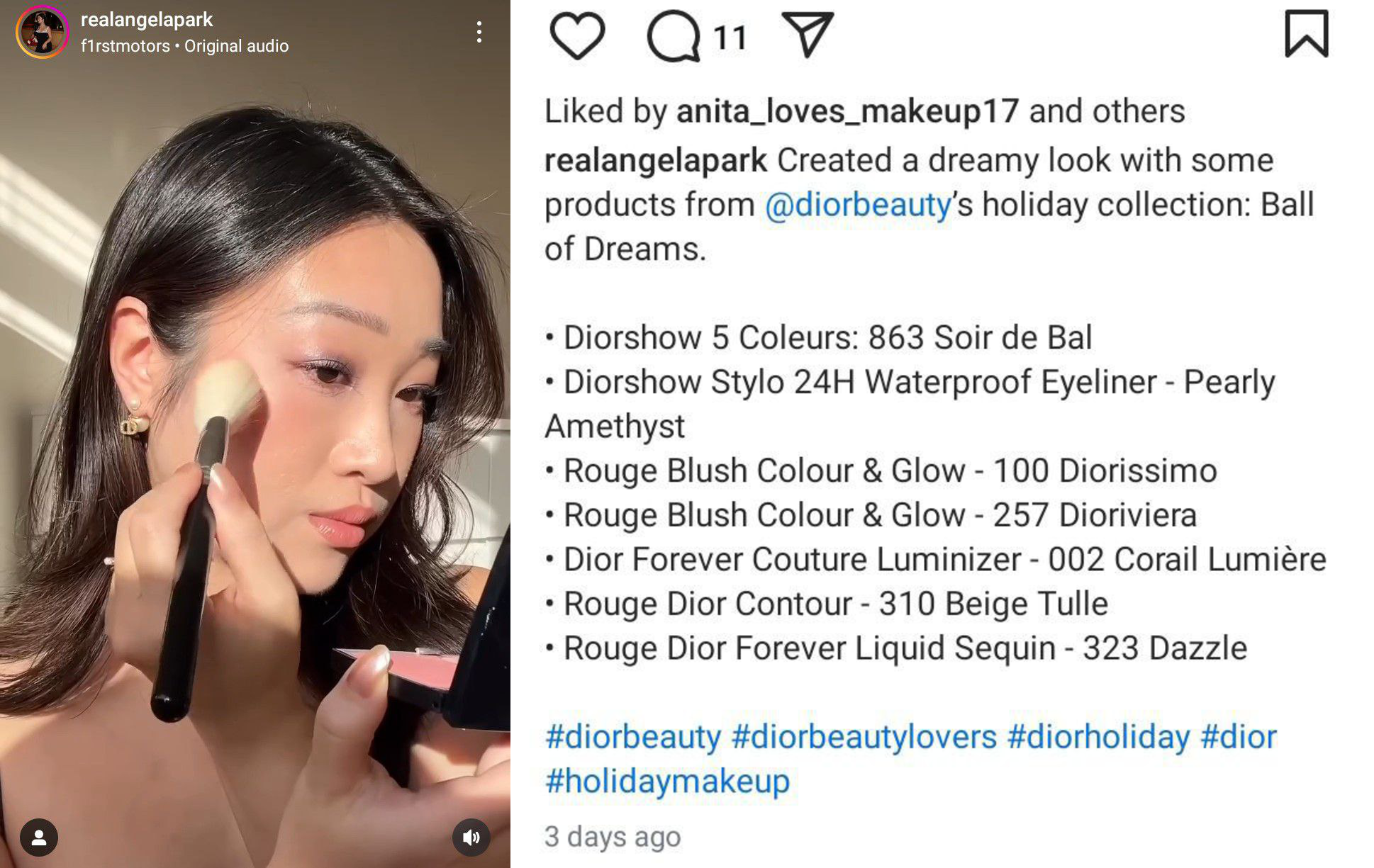 Let’s look at the user-generated content by a microblogger advocating for Dior’s products. This influencer shares the beauty products from the new collection she’s using. She tags the business and uses branded hashtags the company will definitely notice.