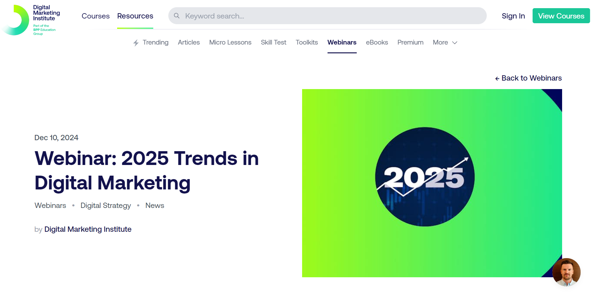 Below is one of the webinars hosted by the Digital Marketing Institute. The company invites people to explore “Trends in Digital Marketing in 2025” by listening to three experts who discuss the rise of alternative social platforms and the impact of AI on content creation.