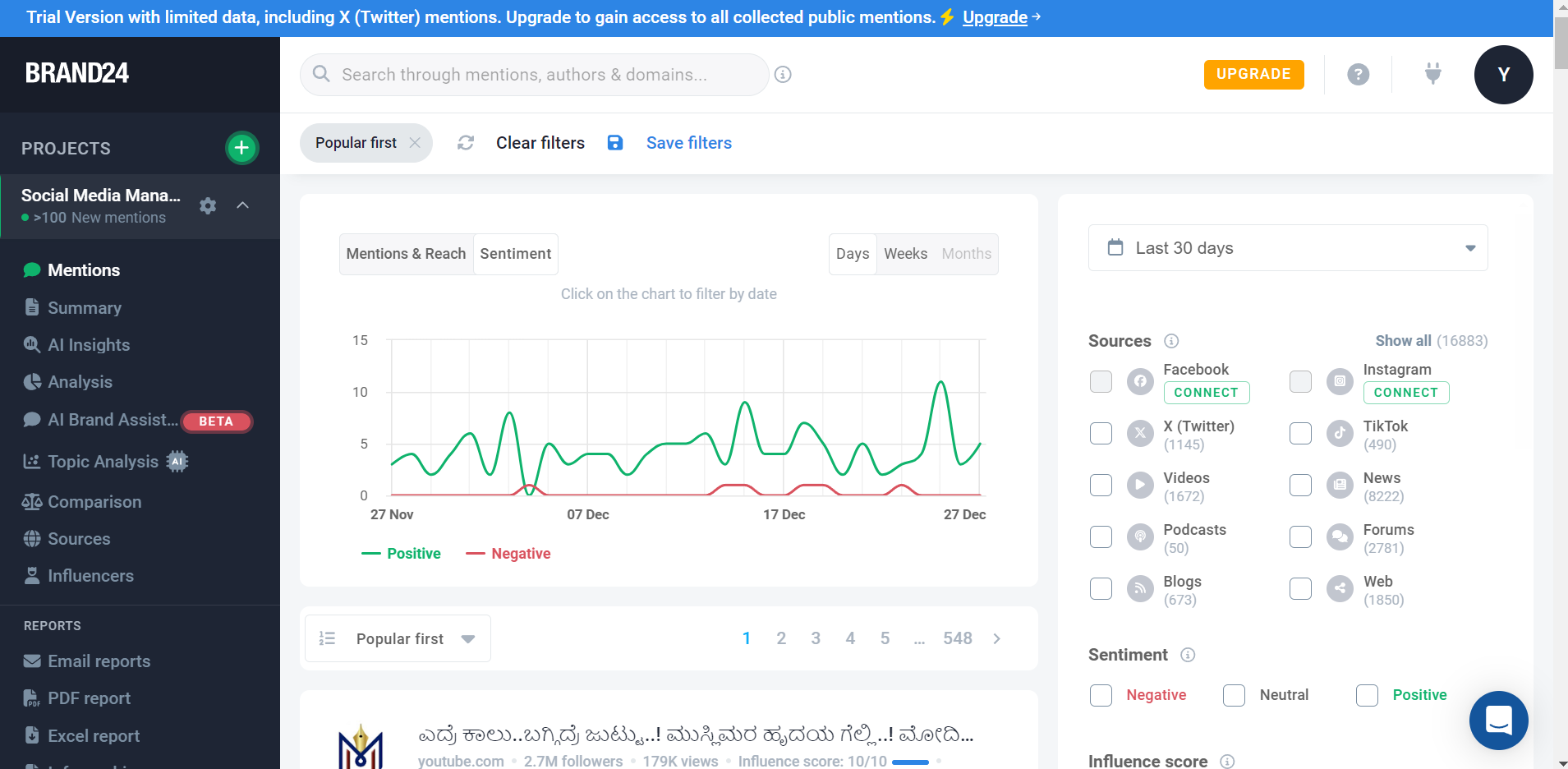 Brand24 is a social listening platform that helps you drive success across multiple online channels and boost your brand visibility. It will provide you with access to mentions across social media, news, blogs, videos, forums, podcasts, reviews, and even more sources. Advanced sentiment analysis will not only help you gather customer feedback but also segment it based on clients’ emotions, such as positive, negative, or neutral. When using the service, you can effectively assess your reach, brand awareness, and use statistics and insights for a better experience and higher customer satisfaction.
