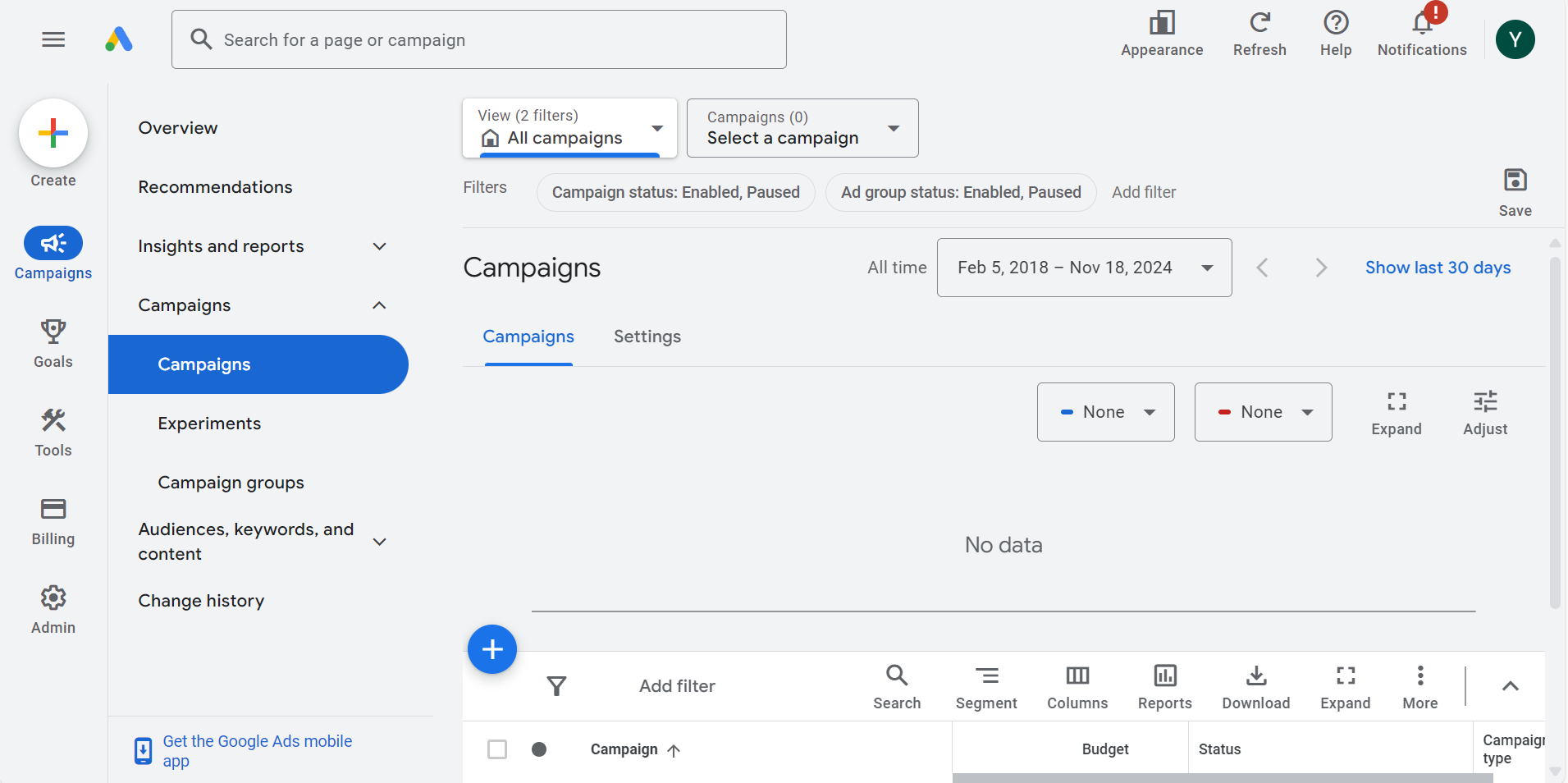 Below, you can see Google Ads’ dashboard for managing campaigns.