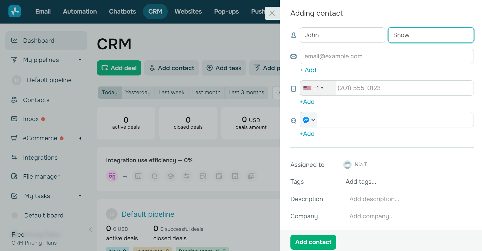 Below you can see how to add a new contact using SendPulse’s CRM.